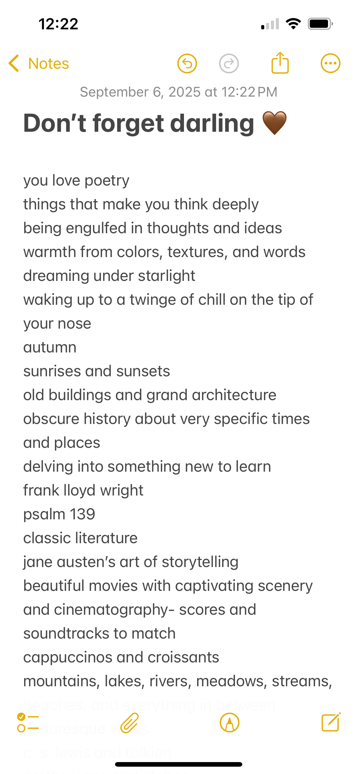 The notes app on my phone has an ever growing list of things I tend to need to remember about myself. The list includes things I enjoy, places I don’t want to forget, feelings I tend to brush over. I love going back to this list and visually seeing a little snippet of my journey through becoming me. This list has helped me realize that who I am under all the layers wasn’t gone, just hidden. I wasn’t too far away from who I truly am or lost completely. Over the years, I just let other things overtake me: expectations, people-pleasing, fears, and feelings of wanting to belong. All at the expense of being me.
